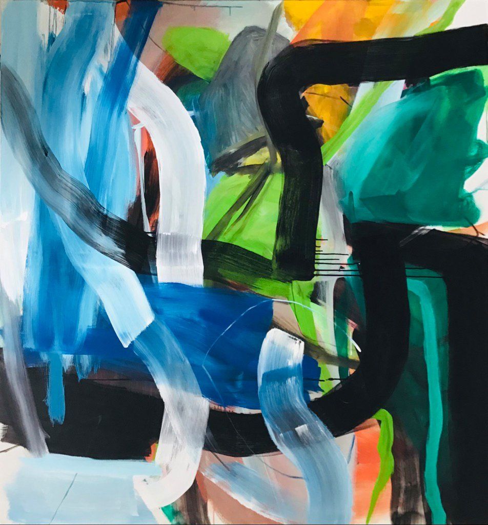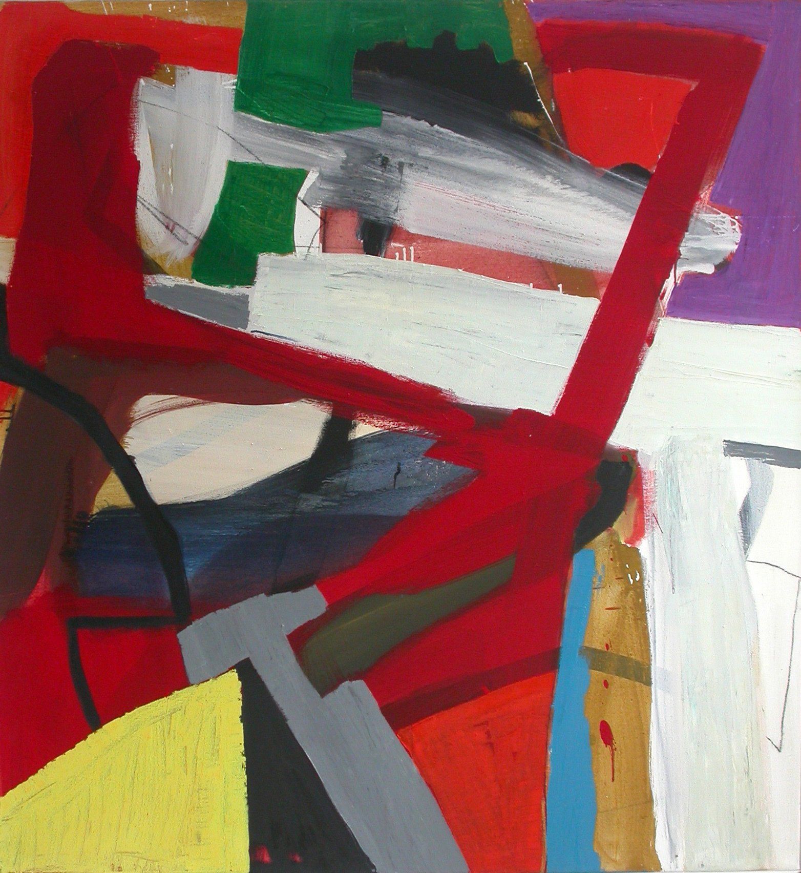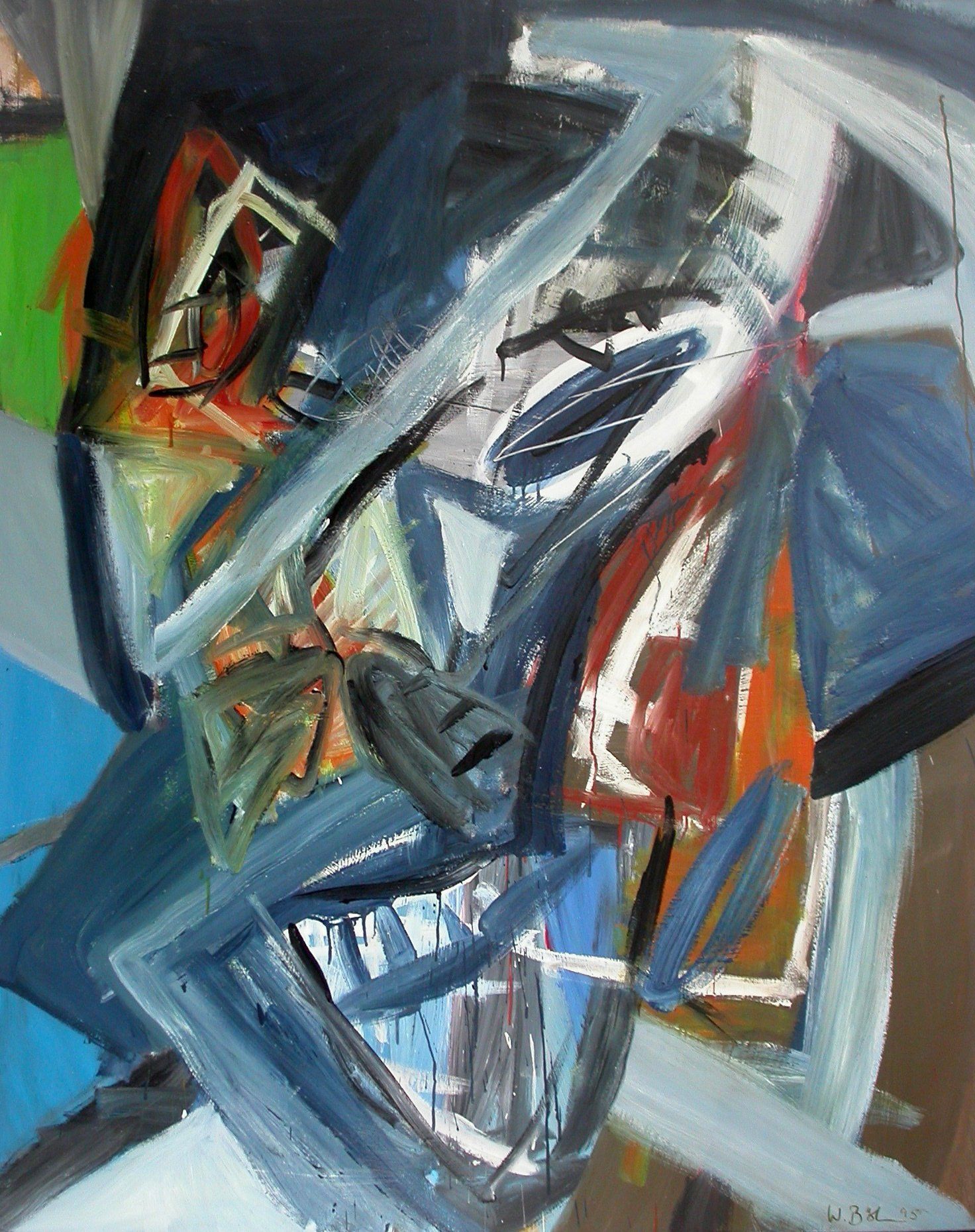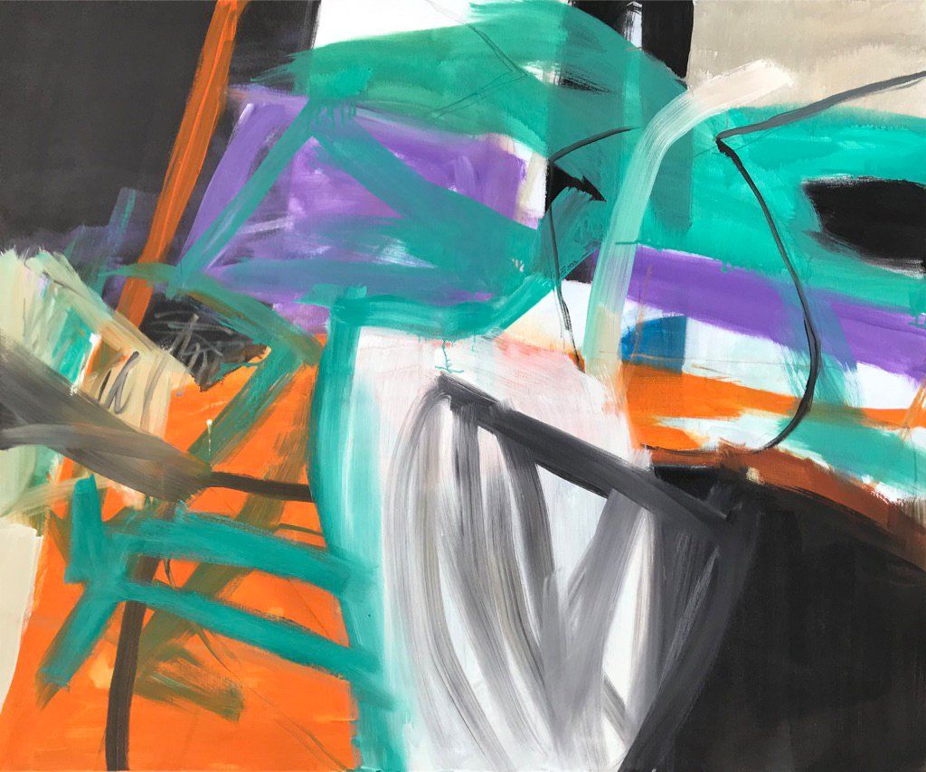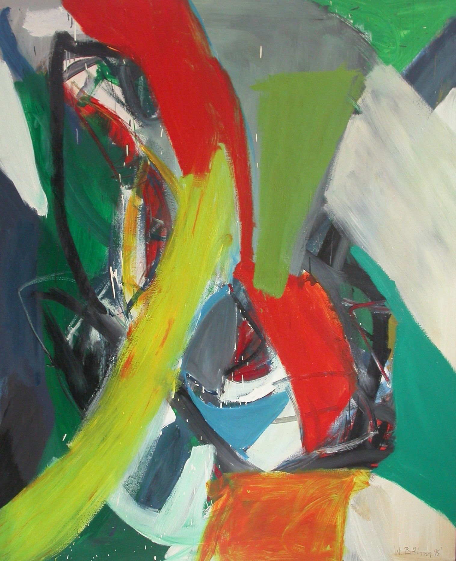 Die Farbe kann gedämpft sein oder kontrastreich, immer ist sie schwergewichtig. Dynamische Farbschwünge verschlingen sich, verbreitern sich zu richtungsweisenden Bahnen, verdichten sich zu Knäueln und geben verschiedene Perspektiven frei. Sie schichten sich zu Gerüsten, die dahinterliegende Ebenen erkennen lassen, weisen über den Bildraum hinaus und haben trotzdem einen klaren inneren Schwerpunkt.