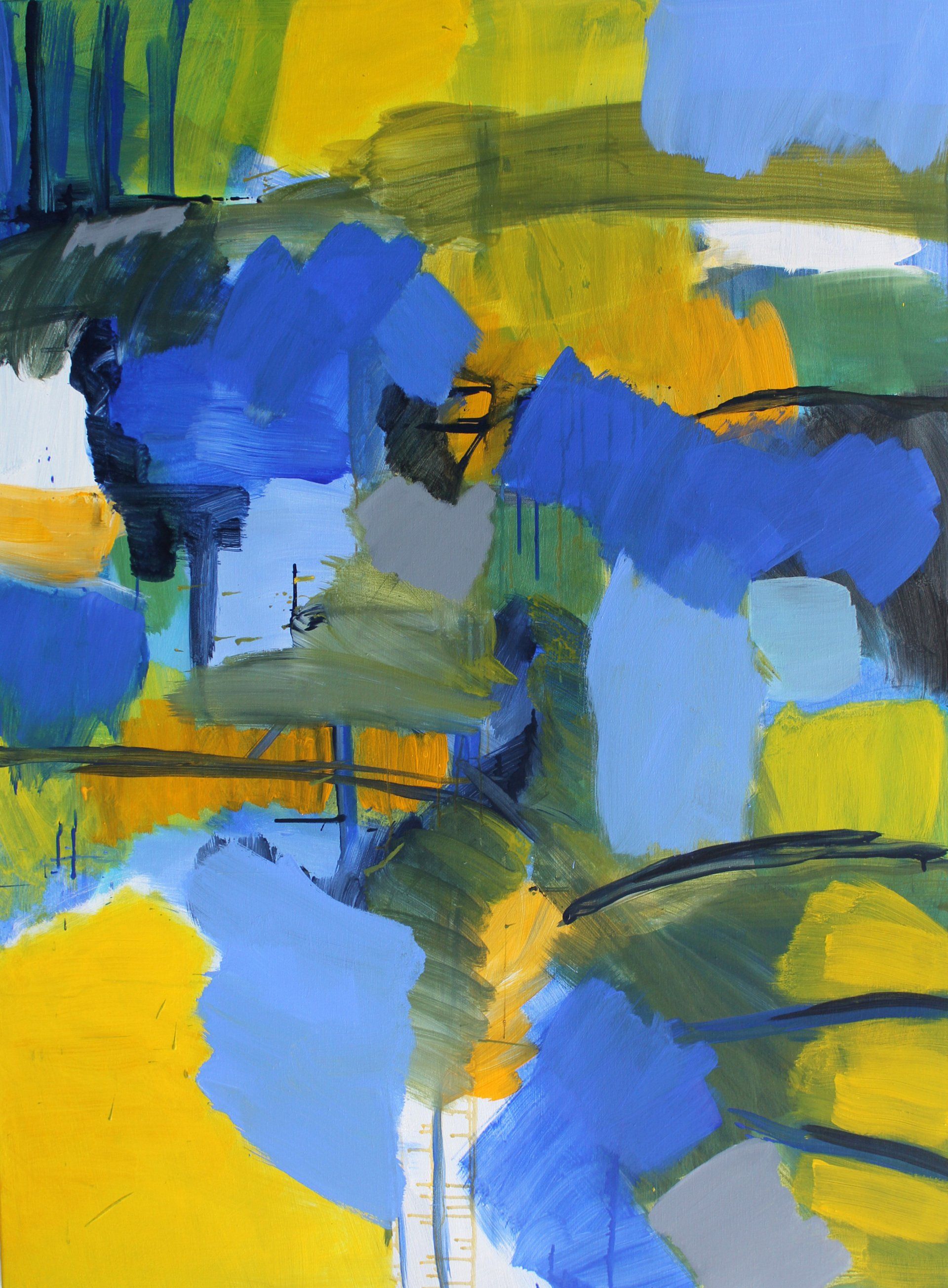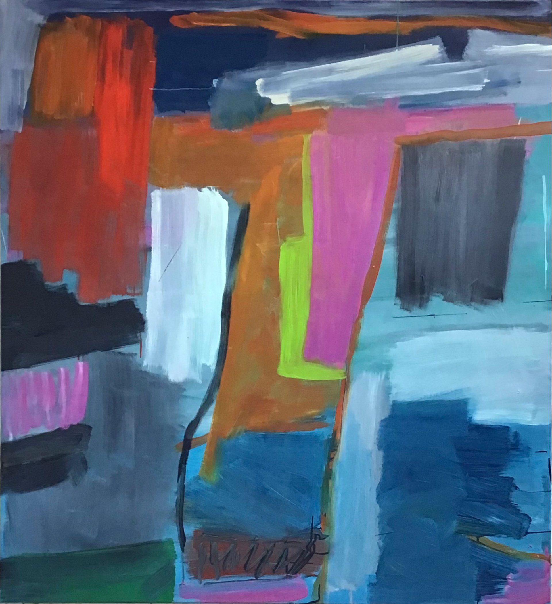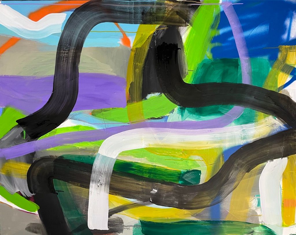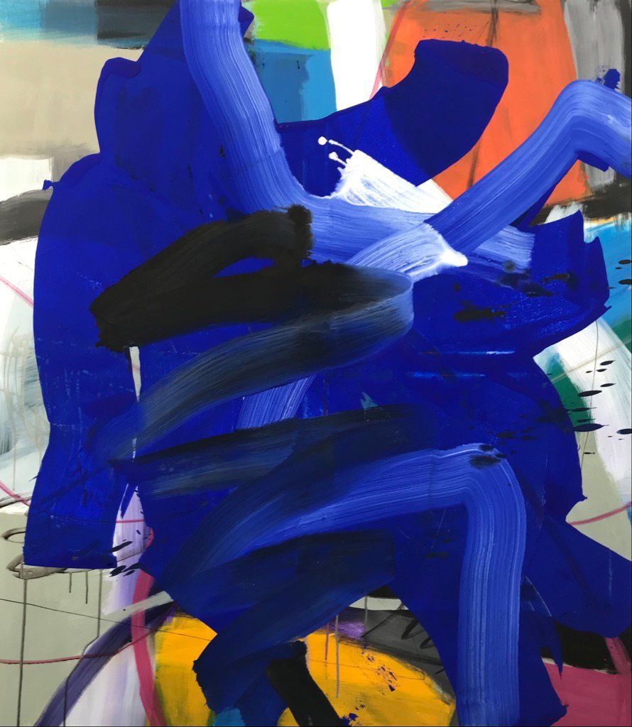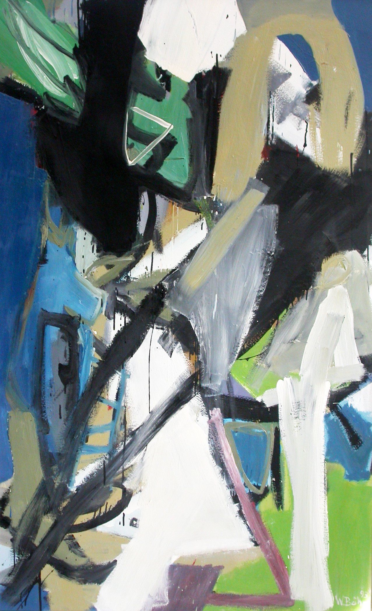 Die Farbe kann gedämpft sein oder kontrastreich, immer ist sie schwergewichtig. Dynamische Farbschwünge verschlingen sich, verbreitern sich zu richtungsweisenden Bahnen, verdichten sich zu Knäueln und geben verschiedene Perspektiven frei. Sie schichten sich zu Gerüsten, die dahinterliegende Ebenen erkennen lassen, weisen über den Bildraum hinaus und haben trotzdem einen klaren inneren Schwerpunkt.