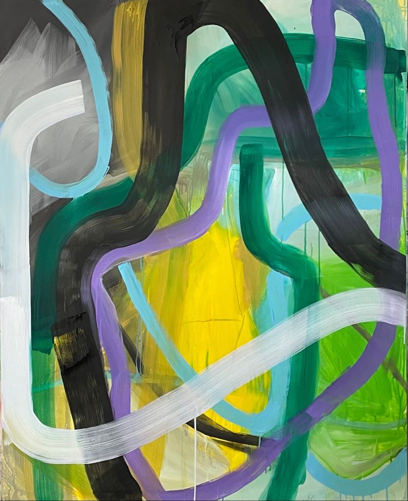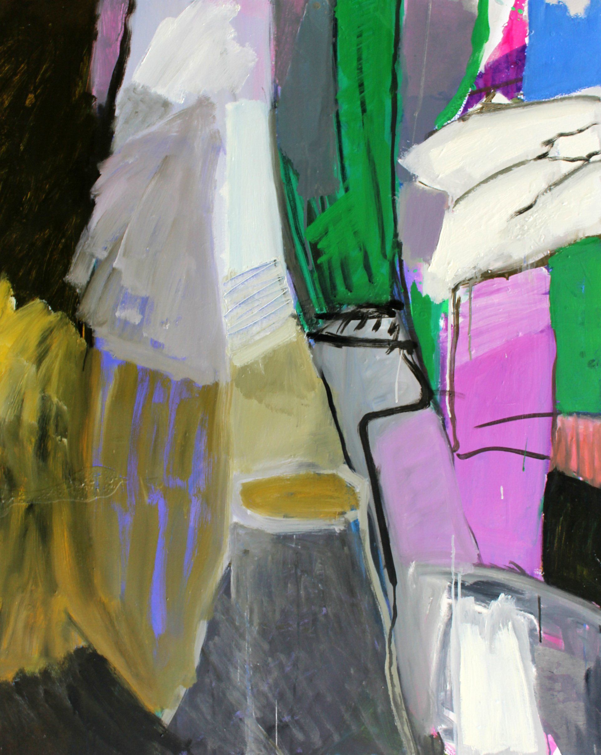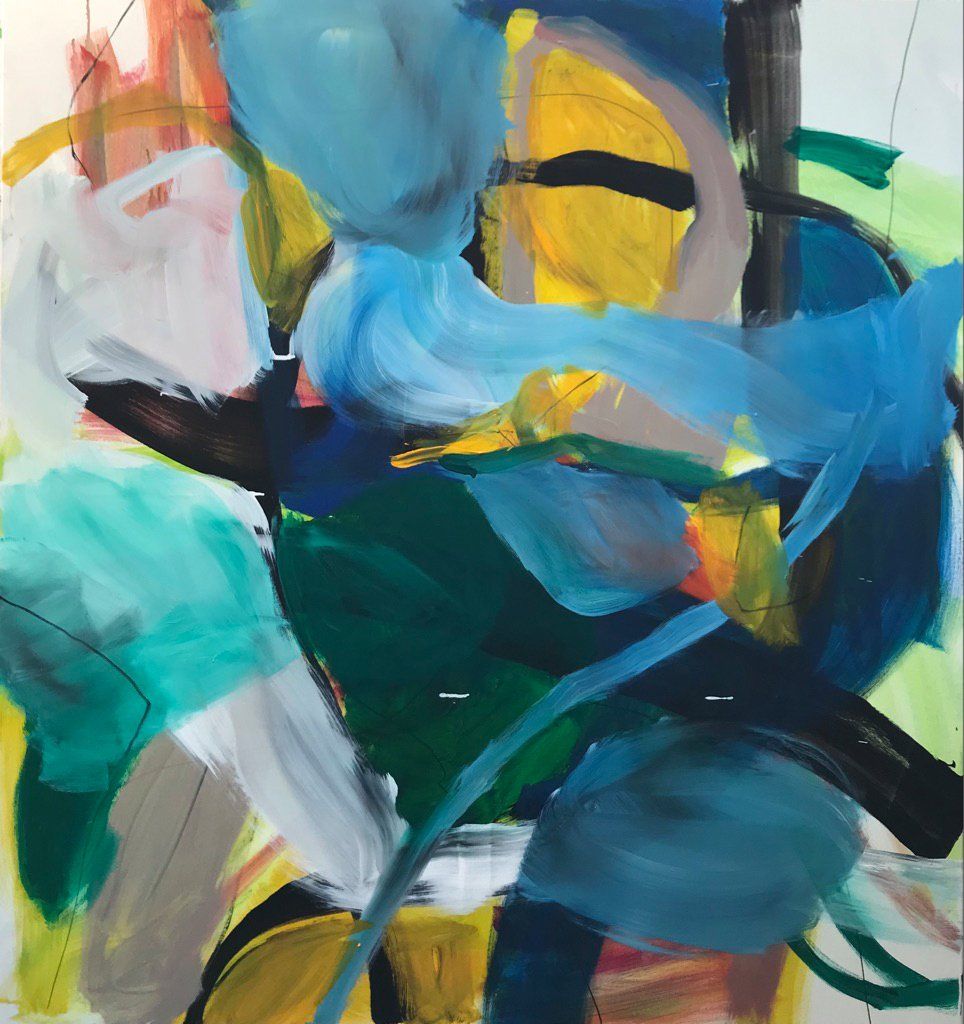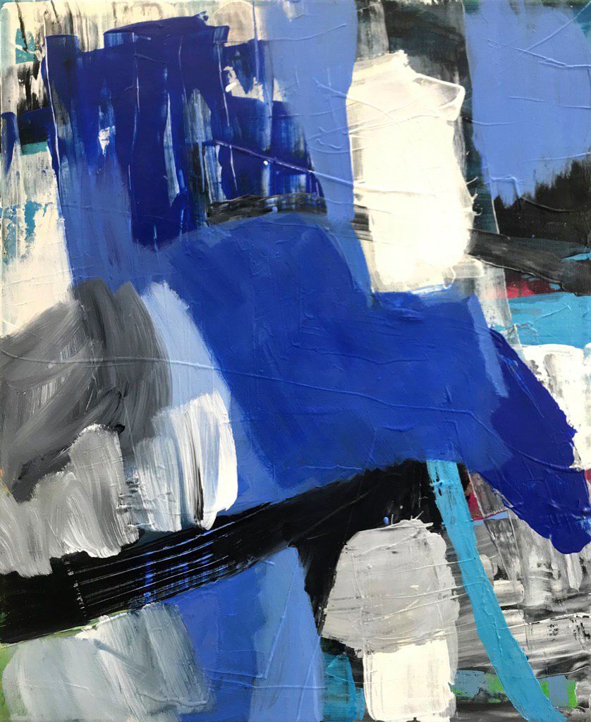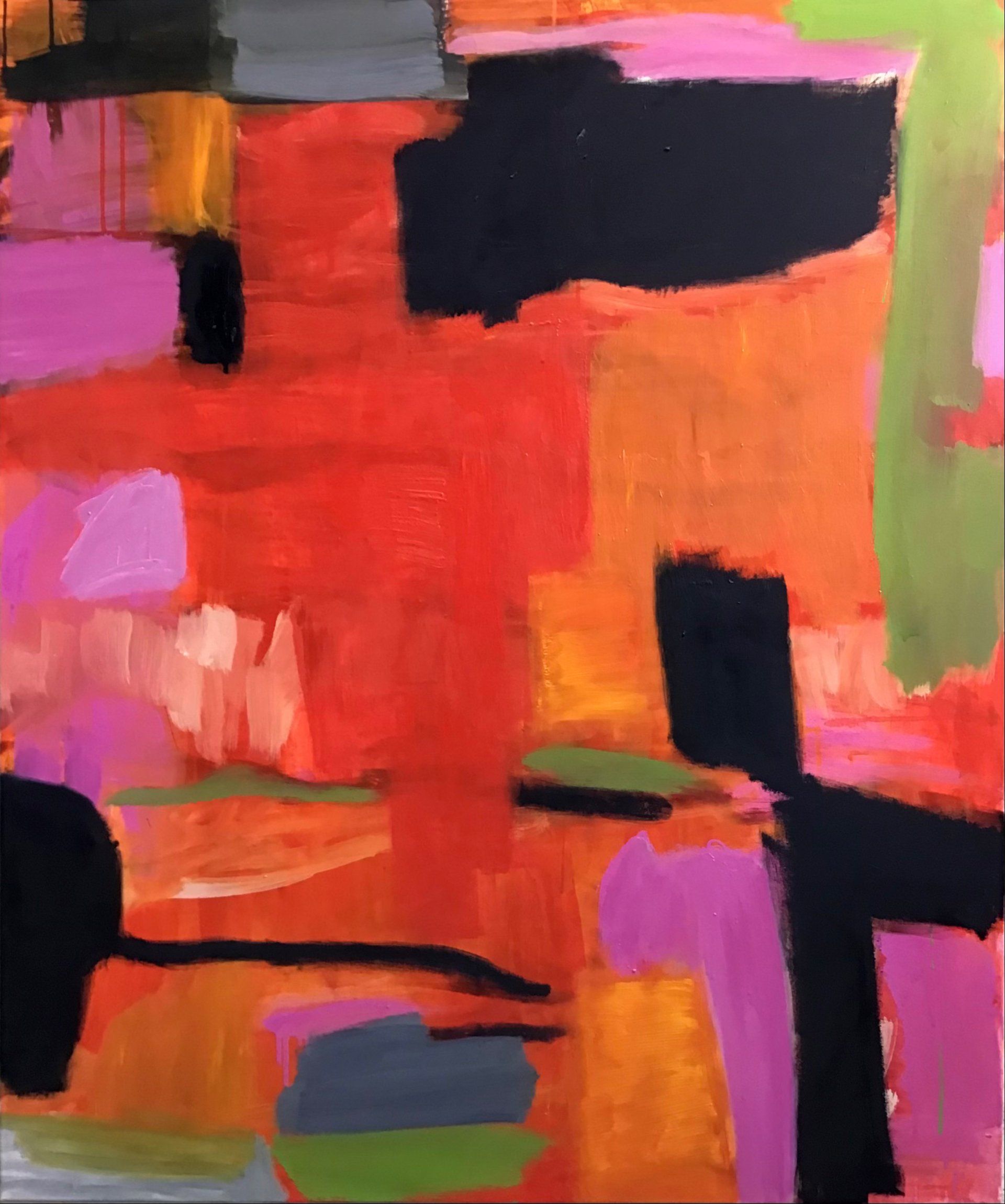 Die Farbe kann gedämpft sein oder kontrastreich, immer ist sie schwergewichtig. Dynamische Farbschwünge verschlingen sich, verbreitern sich zu richtungsweisenden Bahnen, verdichten sich zu Knäueln und geben verschiedene Perspektiven frei. Sie schichten sich zu Gerüsten, die dahinterliegende Ebenen erkennen lassen, weisen über den Bildraum hinaus und haben trotzdem einen klaren inneren Schwerpunkt.