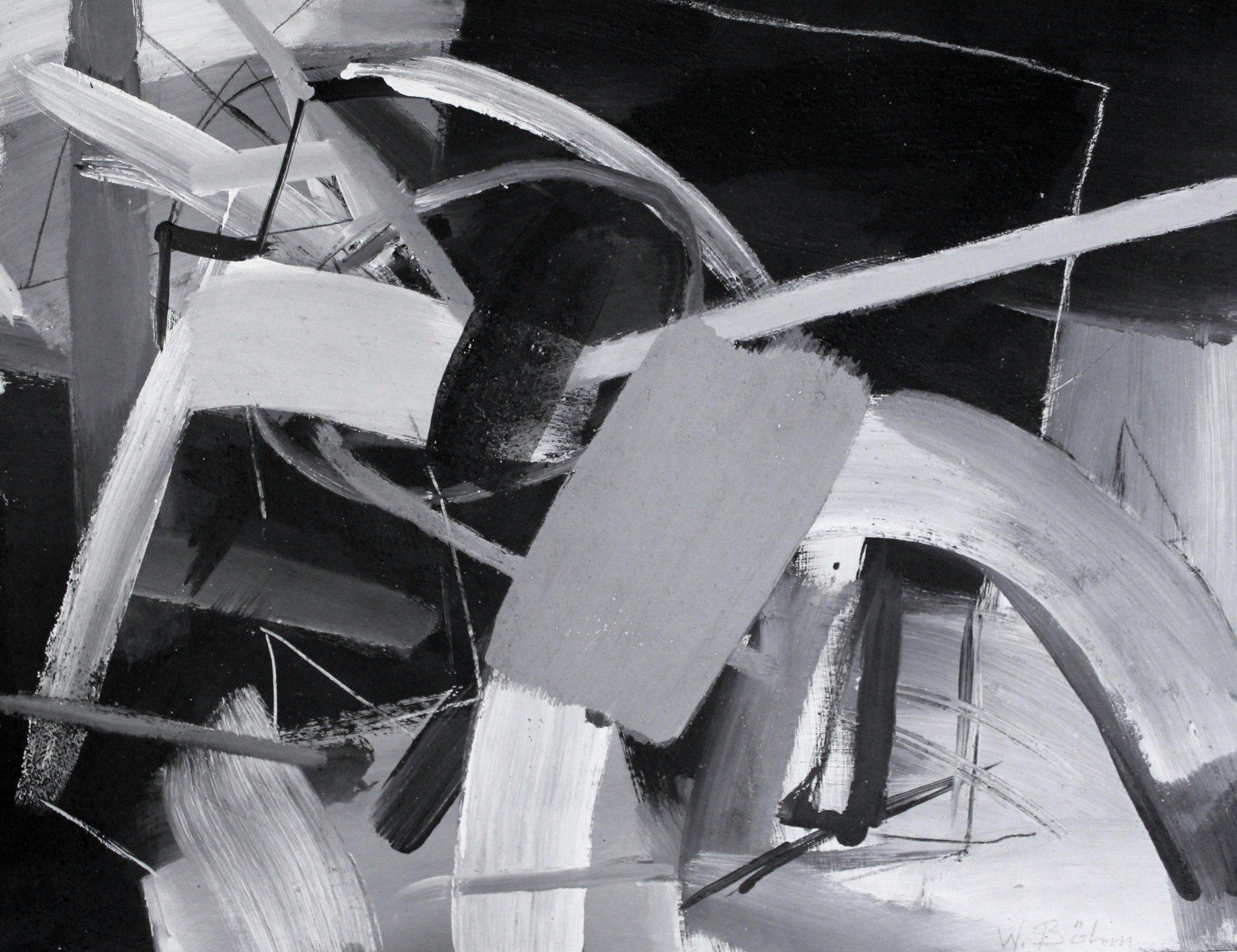 Spontan, ohne Vorzeichnung oder Skizze, legt Walter Böhm kraftvolle, breite Farbbahnen über den Malgrund, baut Bildraum von hinten nach vorne auf und läßt so durch Überlagerungen räumliche Strukturen entstehen, die mehrfache Perspektiven und Durchblicke auf vorhergehende Schichten ermöglichen. Doch der spontane Zugriff macht allein das Bild noch nicht aus. Er schafft Konflikte, die nach Lösungen suchen. Böhm sucht sie in der Dialektik einer Malerei, die bewußt durch Überschneiden, Verdecken, Offenlassen zu Ergebnissen findet, die nur bedingt absehbar sind. In diesem Malprozess wird das Thema durch Demontage und Konstruktion verinnerlicht und in die Malerei entlassen.